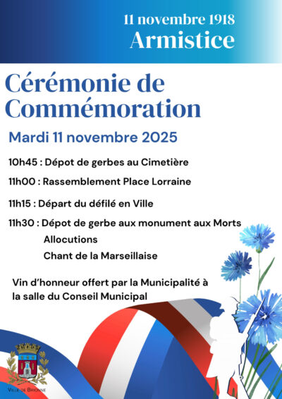 Prochainement La ville de Brionne vous invite à la Cérémonie de Commémoration de l'Armistice du 11 novembre. Rendez-vous le mardi 11 novembre 2025 à partir ... mardi 11/11 Cérémonie de Commémoration du 11 novembre