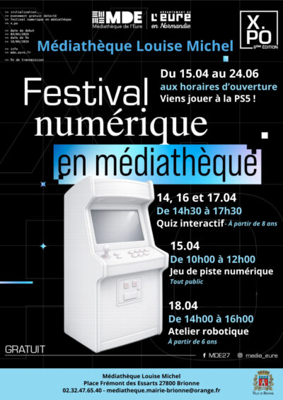 Prochainement Rendez-vous à la médiathèque Louise Michel pour la 8ème édition du festival numérique X.PO ! Au programme : Les mardis 14, ... du mardi 14/04 au samedi 18/04 Festival du numérique : X.PO