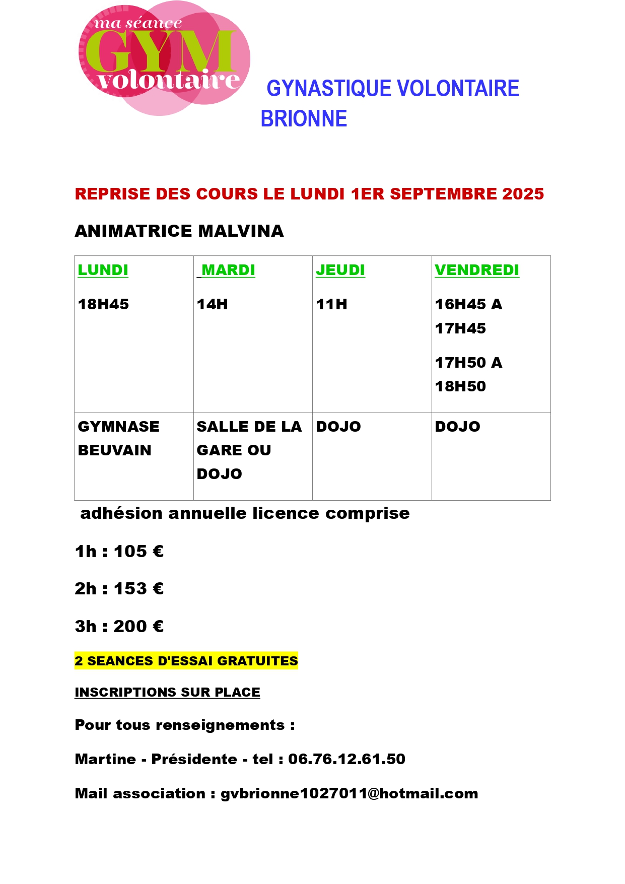 Vous êtes ici : Accueil » Loisirs, culture et sport » Associations » GYMNASTIQUE VOLONTAIRE BRIONNE