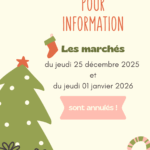 Pour Information Les marchés du jeudi seront annulés pendant les vacances de Noël. En vous souhaitant de bonnes fêtes de fin d'année ! ... Article publié le vendredi 5 décembre 2025
