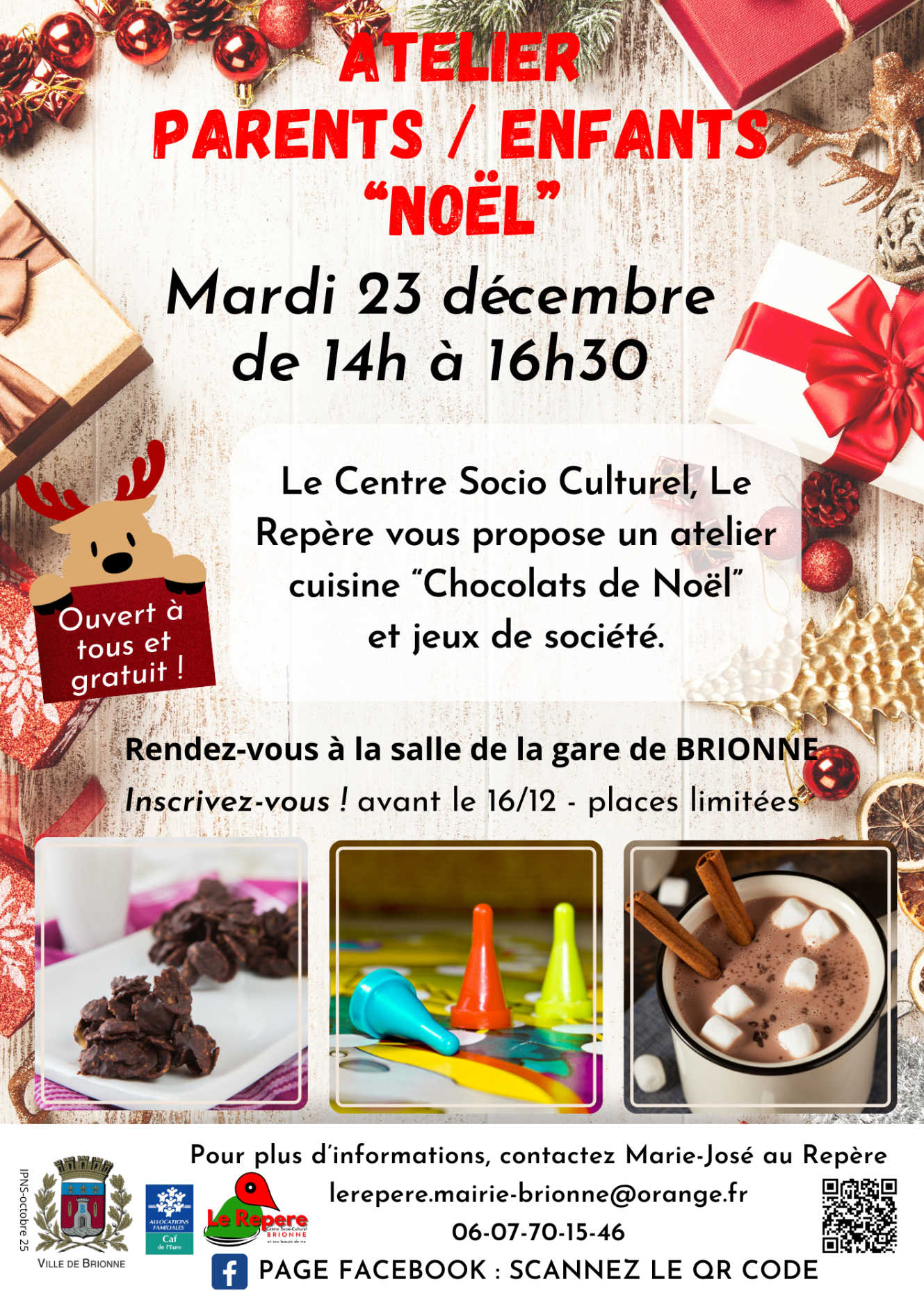 Le Centre Socio Culturel « Le Repère, vous propose de vous réunir autour d’un atelier parents / enfants « Noël » durant lequel vous concocterez des petites gourmandises et des jeux de société vous seront proposés.