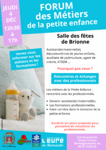 Vous souhaitez travailler auprès des tout-petits ? Venez découvrir les métiers de la petite enfance lors de notre forum jeudi 4 décembre de 13h30 à 17h à la salle des fêtes de Brionne.