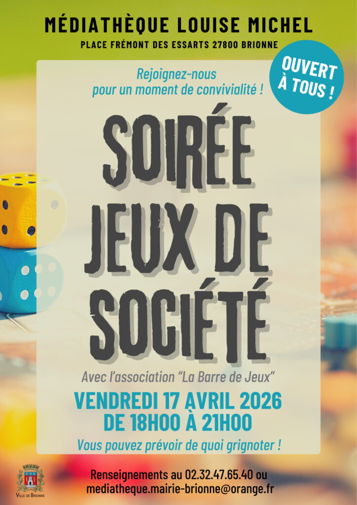 Rendez-vous à la médiathèque Louise Michel le vendredi 17 avril 2026 de 18h00 à 21h00 pour une soirée jeux de société.