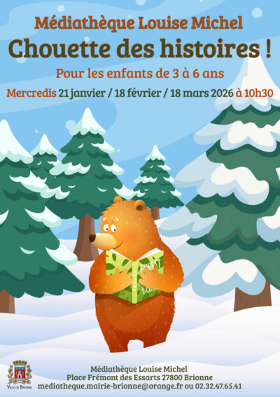 Rendez-vous à la médiathèque Louise Michel pour "Chouette des histoires !" Des histoires pour les enfants de 3 à 6 ans les mercredis 21 janvier, 18 février et 18 mars ...